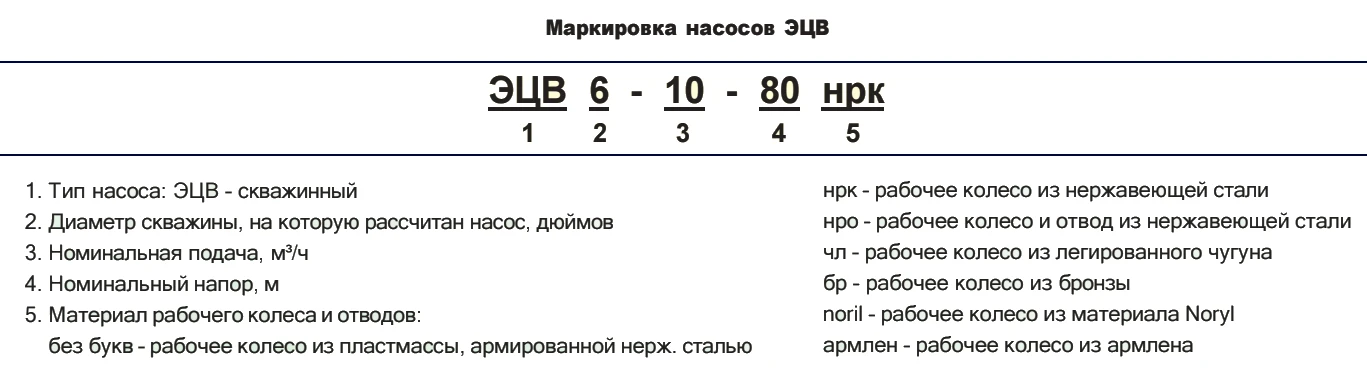Корпус насоса ЭЦВ изготавливается из чугуна или из нержавеющей стали. Рабочие колеса насосов ЭЦВ изготавливаются из армированной нержавеющей сталью пластмассы, нержавеющей стали, чугуна легированного, бронзы (под заказ) и материала Noryl.